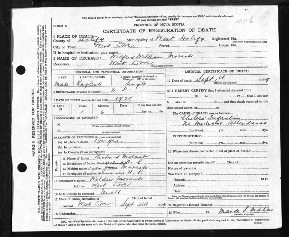 Male Death Registration: Year: 1929 file: 85 number: 1206