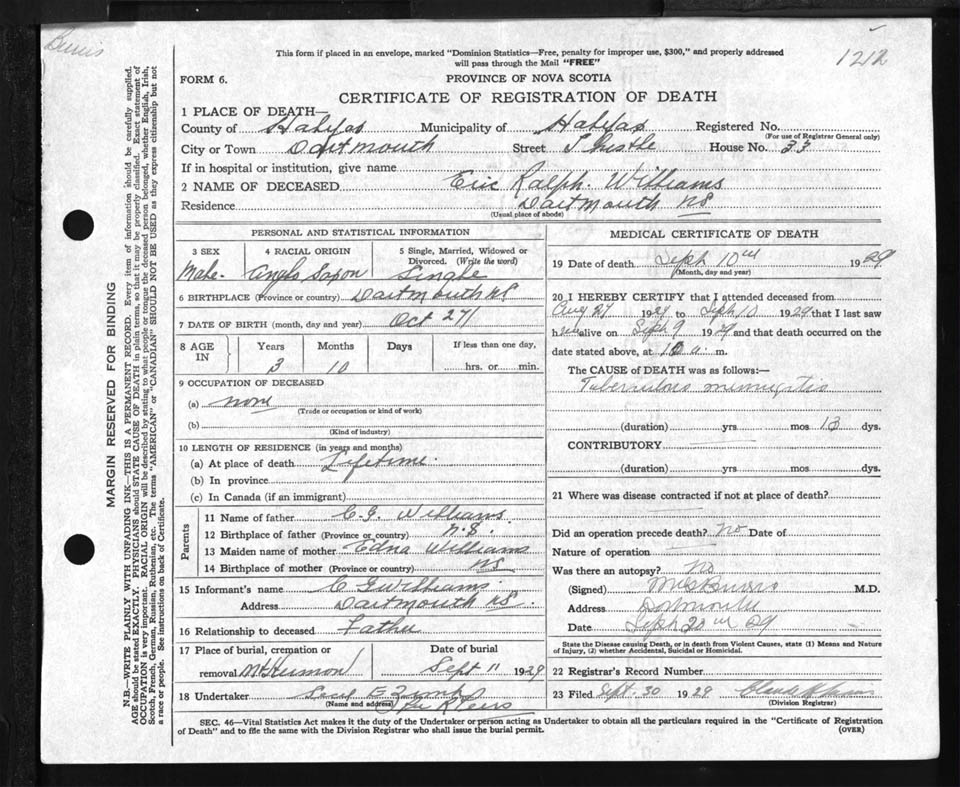 Male Death Registration: Year: 1929 file: 85 number: 1212
