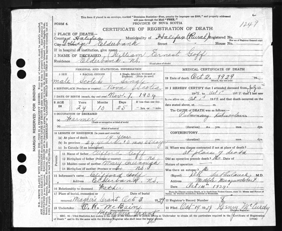 Male Death Registration: Year: 1929 file: 85 number: 1249