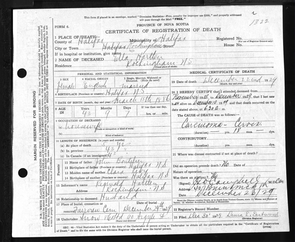 Female Death Registration: Year: 1929 file: 85 number: 1322