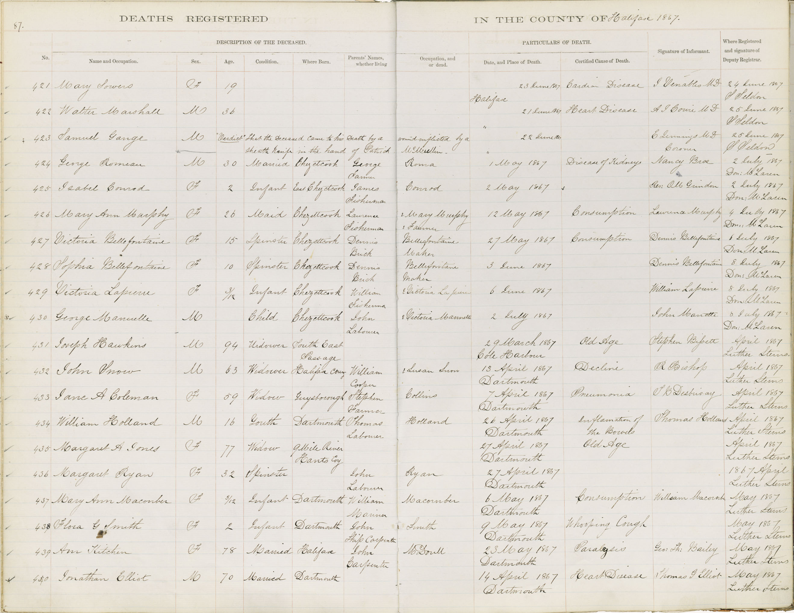 Death Registration: Year: 1867 book: 1808 page: 87 number: 421