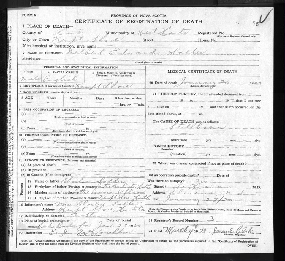 Death Registration: Year: 1920 file: 86 number: 75