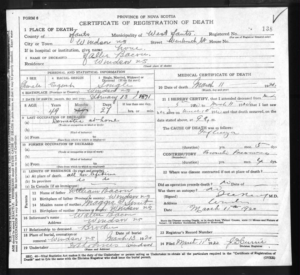 Death Registration: Year: 1920 file: 86 number: 138