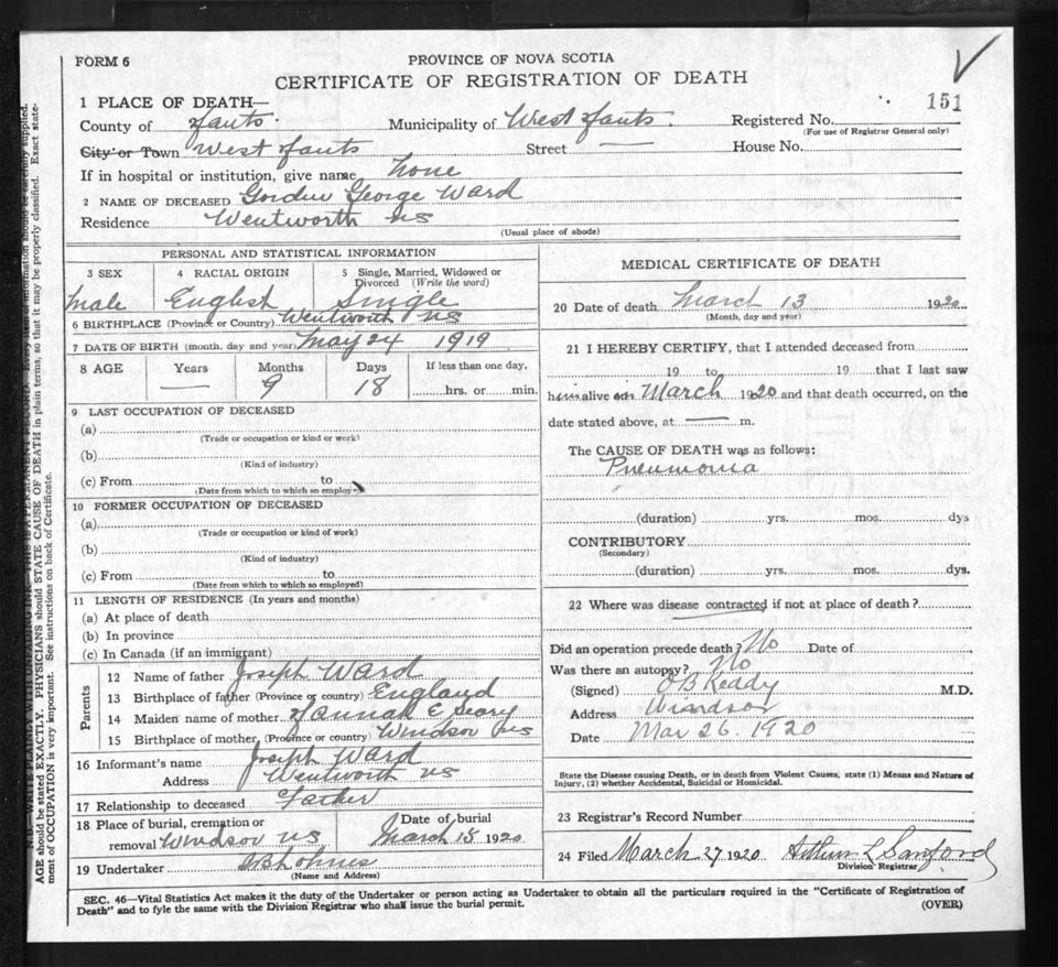 Death Registration: Year: 1920 file: 86 number: 151