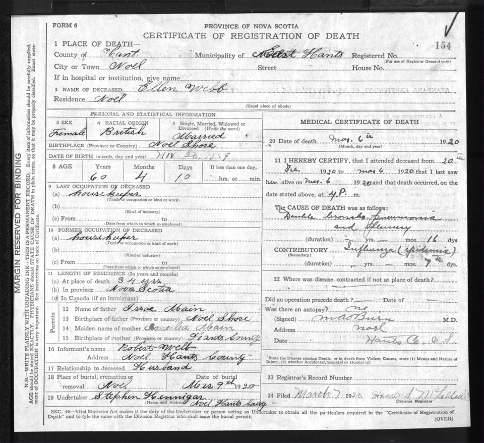 Death Registration: Year: 1920 file: 86 number: 154