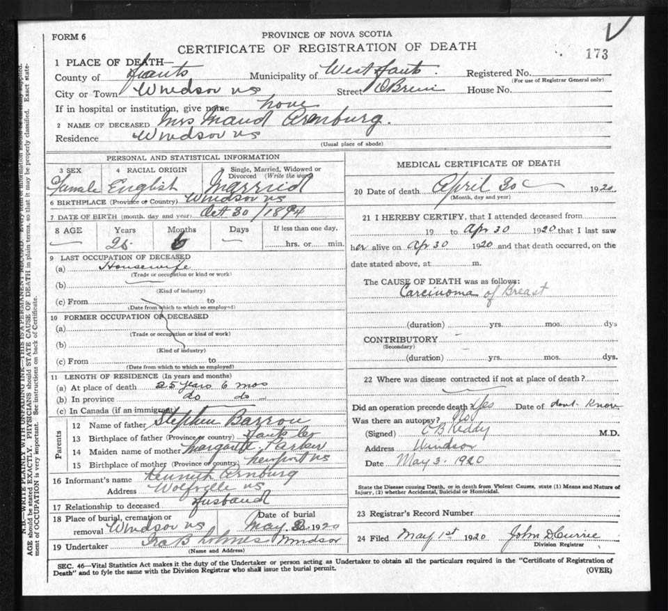 Death Registration: Year: 1920 file: 86 number: 173