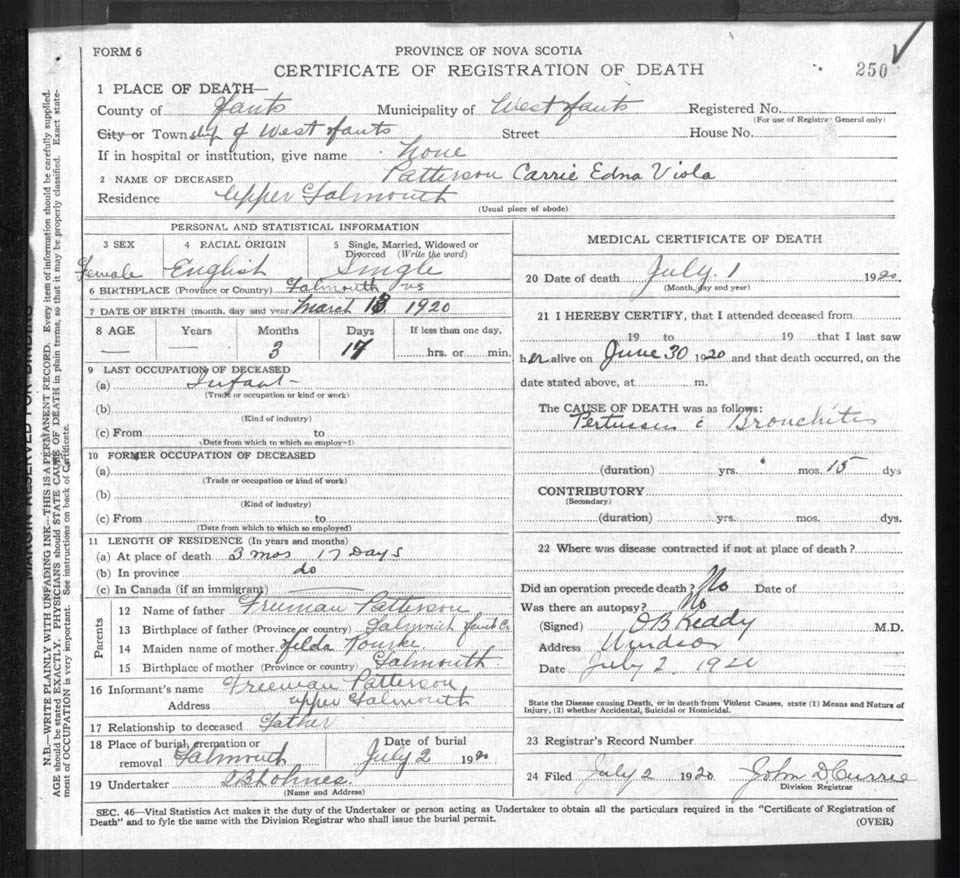 Death Registration: Year: 1920 file: 86 number: 250
