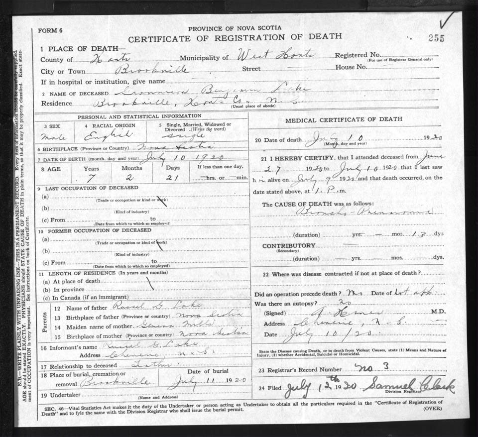 Death Registration: Year: 1920 file: 86 number: 255
