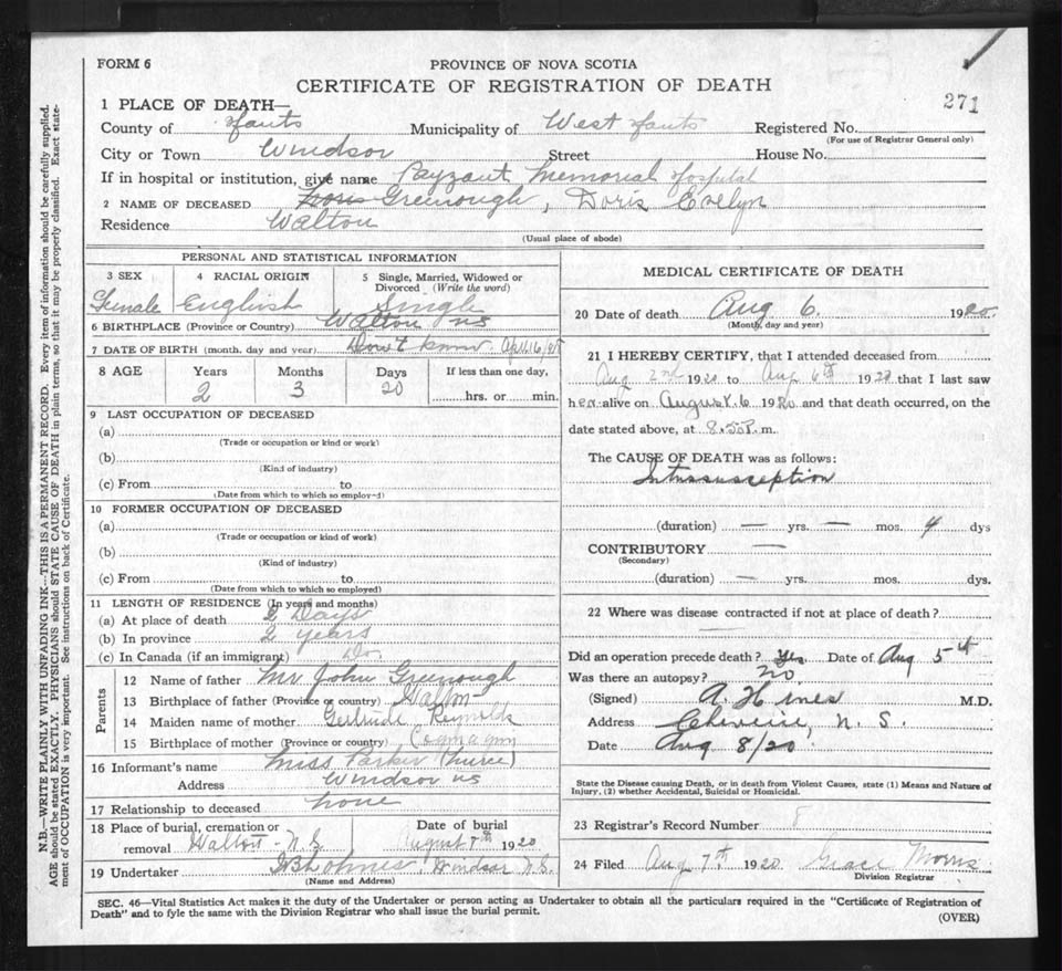Death Registration: Year: 1920 file: 86 number: 271