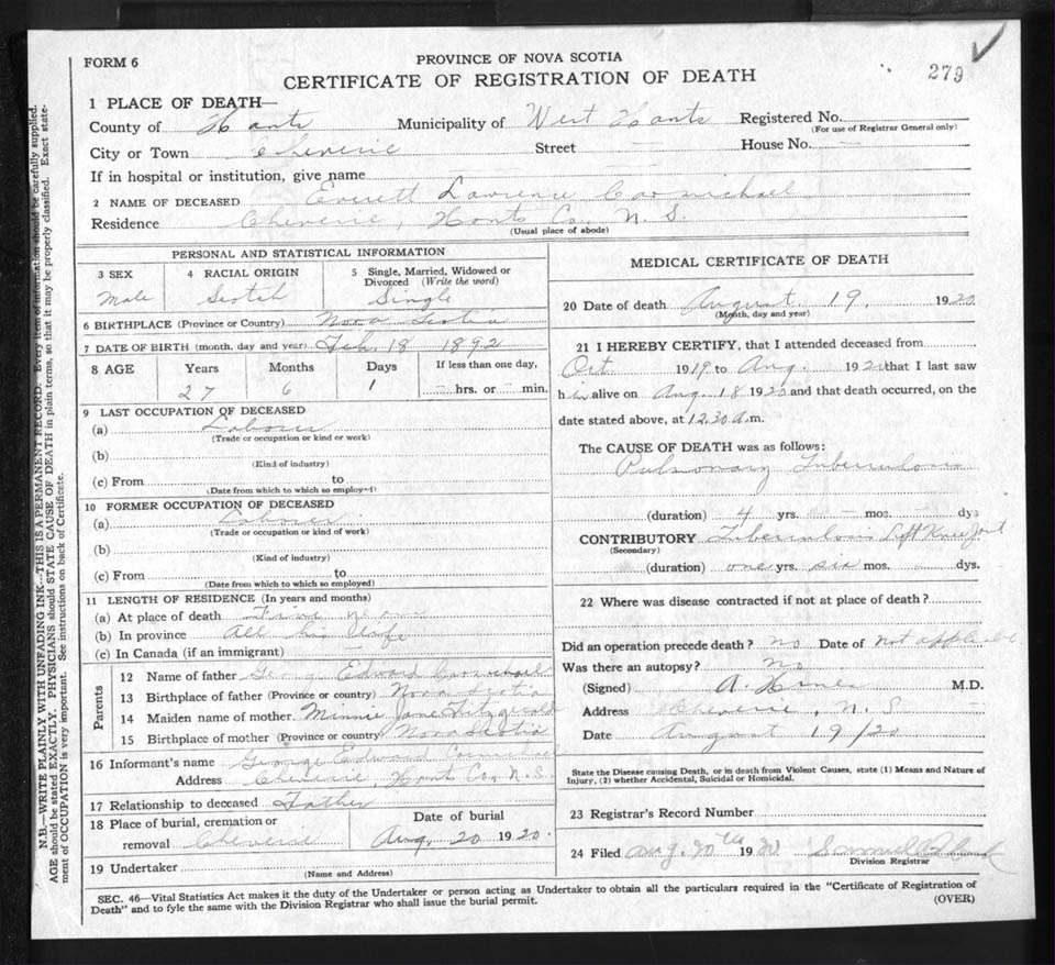 Death Registration: Year: 1920 file: 86 number: 279