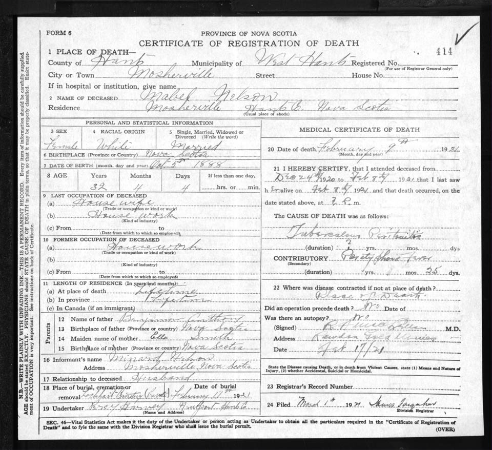 Female Death Registration: Year: 1921 file: 86 number: 414