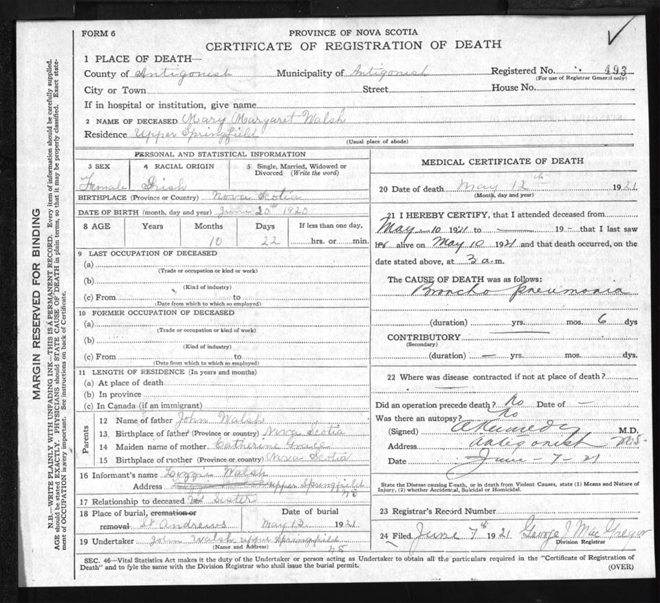 Female Death Registration: Year: 1921 file: 86 number: 493