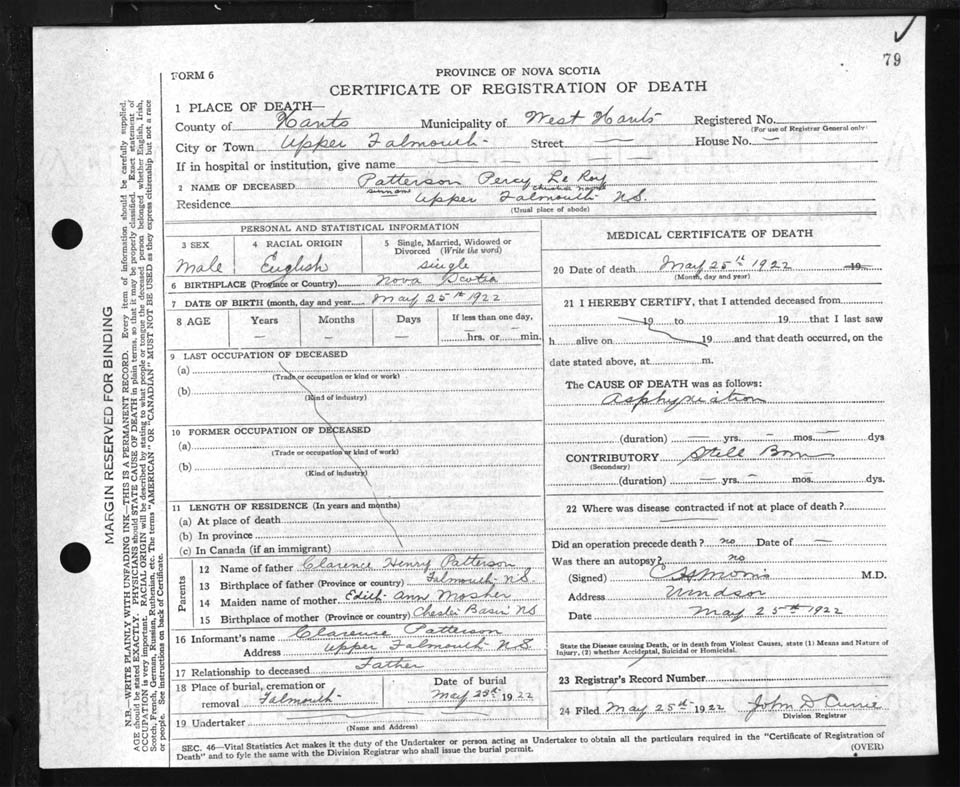 Male Death Registration: Year: 1922 file: 87 number: 79