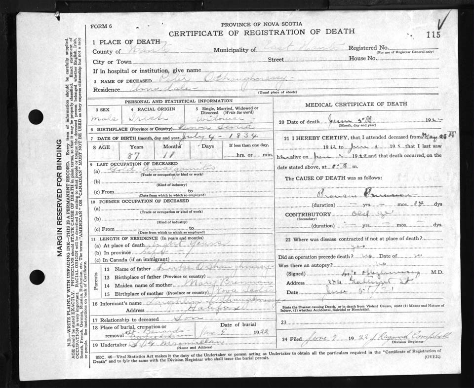 Male Death Registration: Year: 1922 file: 87 number: 115