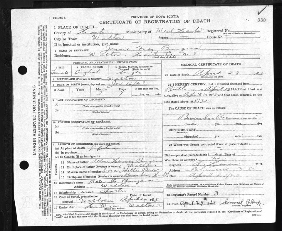 Female Death Registration: Year: 1923 file: 87 number: 330