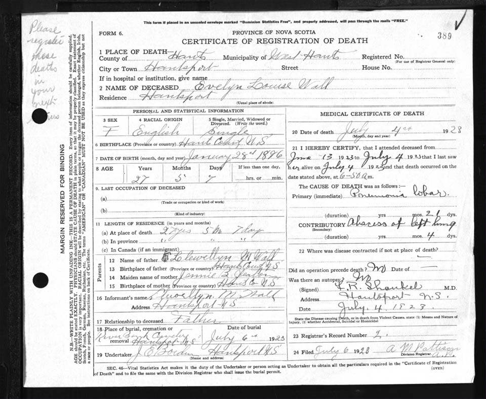 Female Death Registration: Year: 1923 file: 87 number: 389