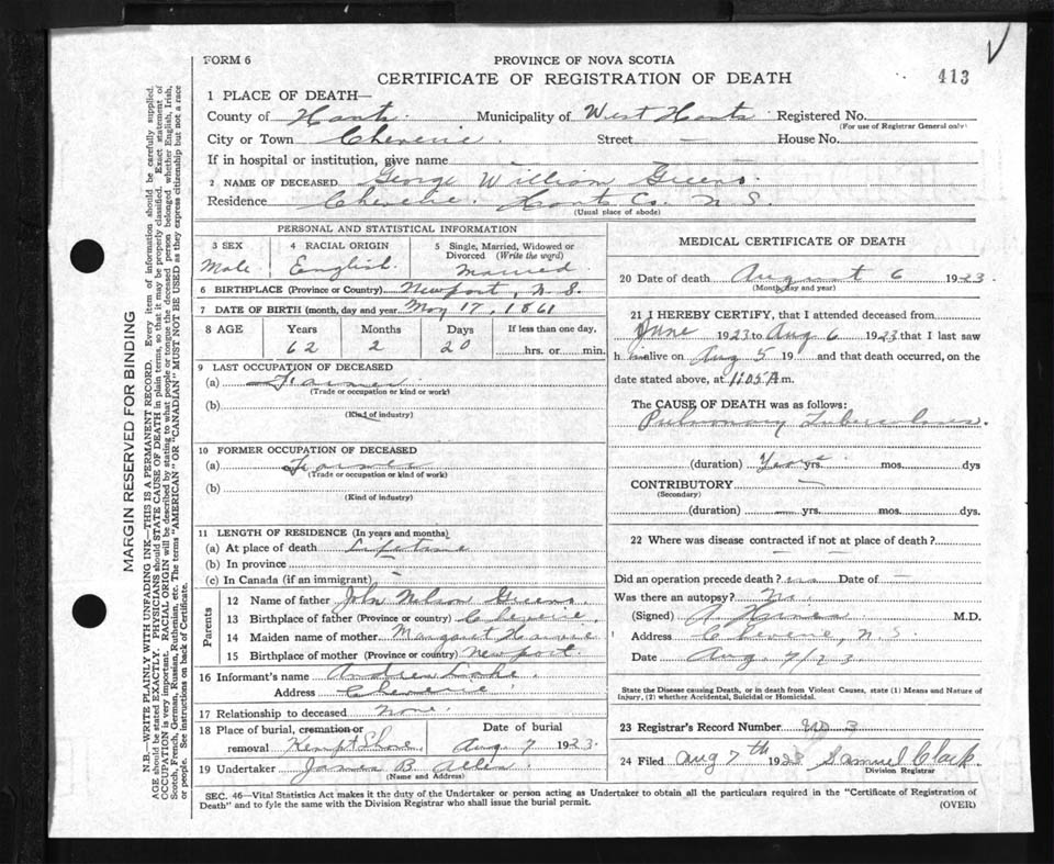 Male Death Registration: Year: 1923 file: 87 number: 413