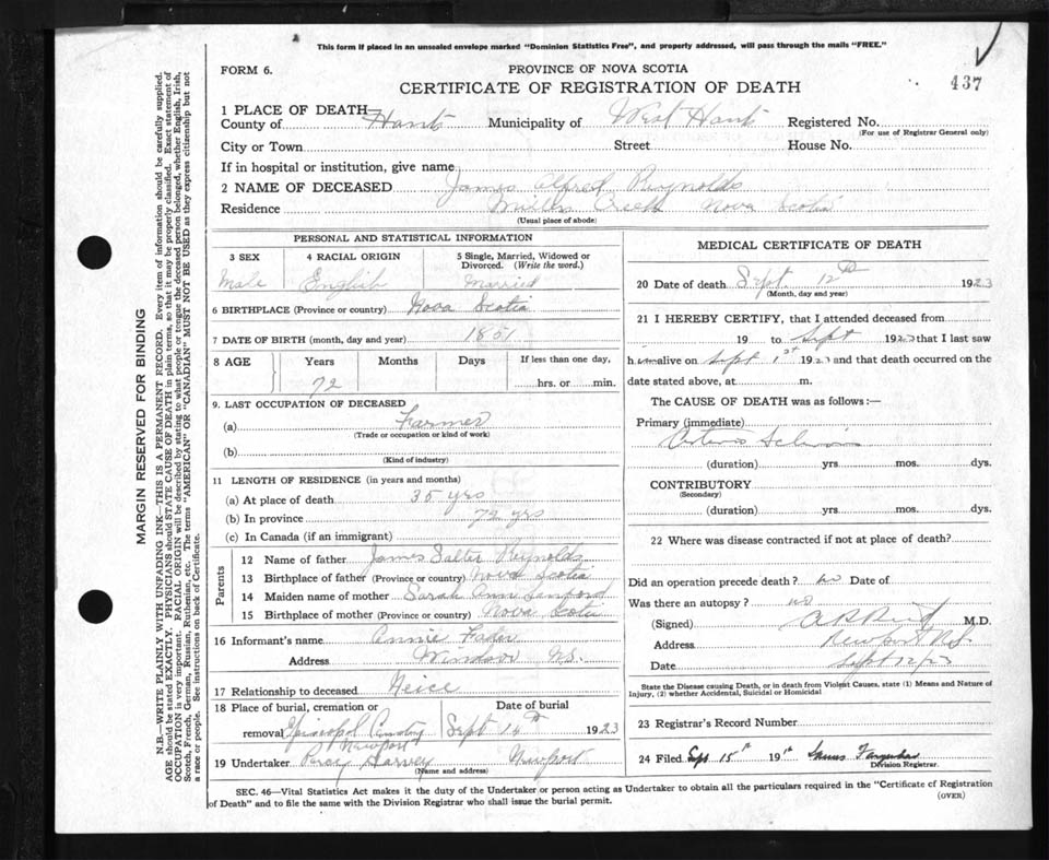 Male Death Registration: Year: 1923 file: 87 number: 437