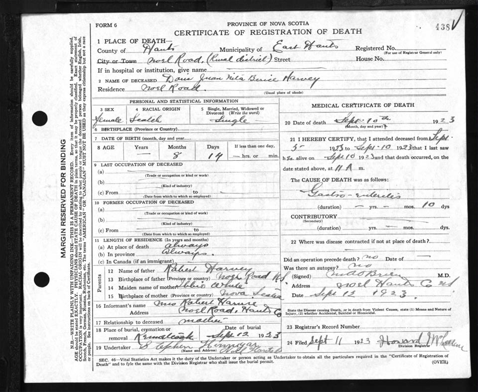 Female Death Registration: Year: 1923 file: 87 number: 438