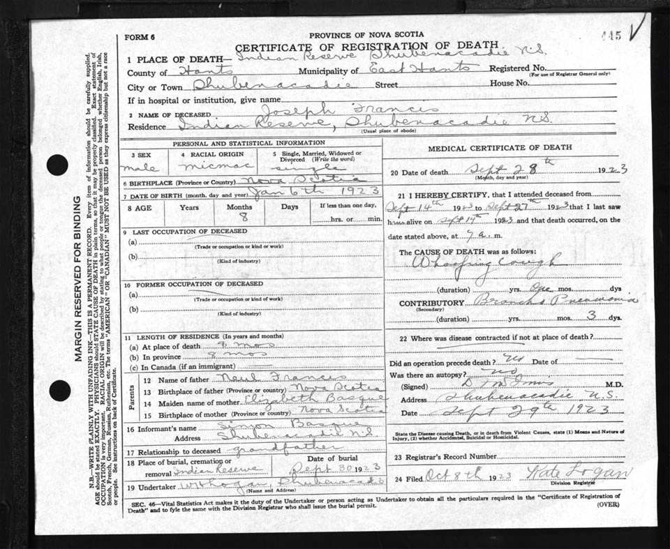 Male Death Registration: Year: 1923 file: 87 number: 445