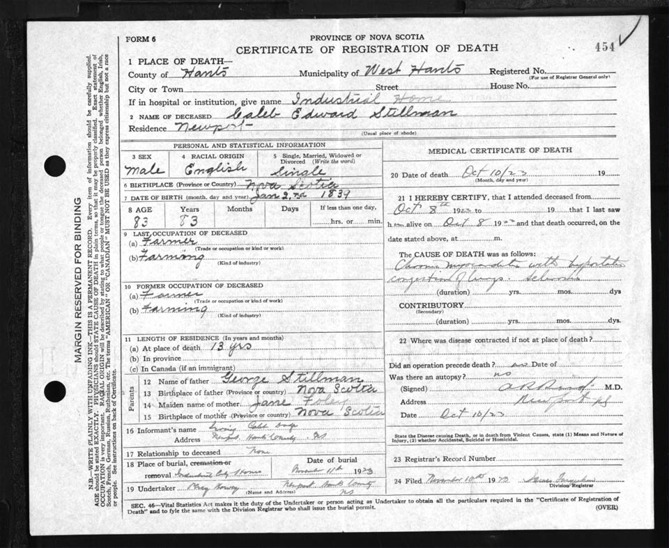 Male Death Registration: Year: 1923 file: 87 number: 454