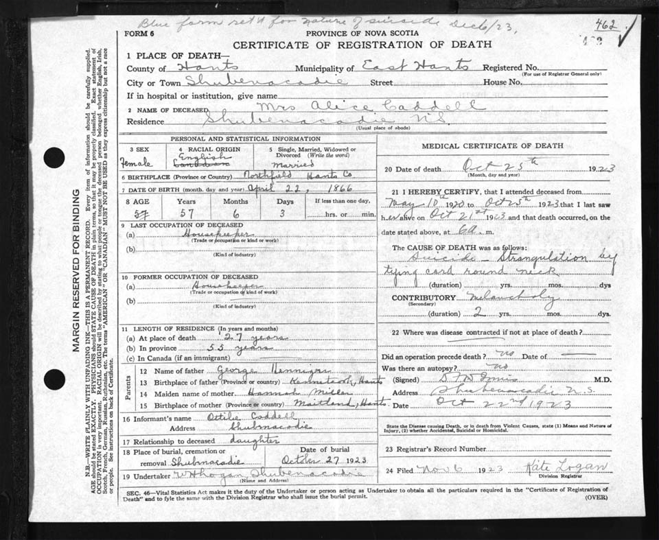 Female Death Registration: Year: 1923 file: 87 number: 462