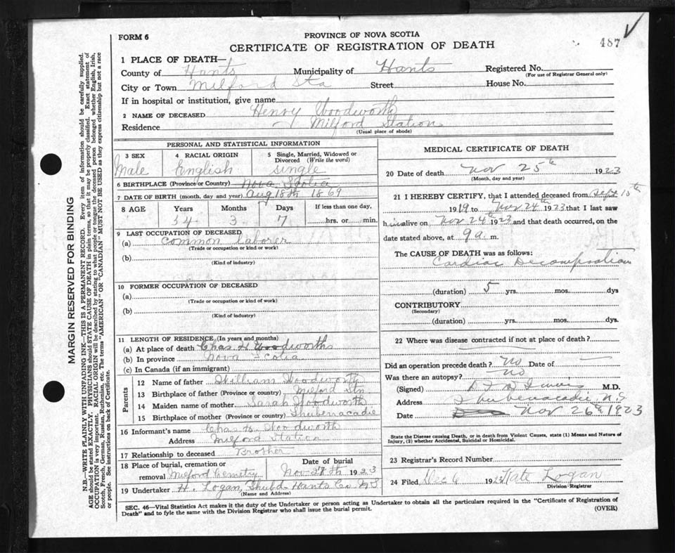 Male Death Registration: Year: 1923 file: 87 number: 487