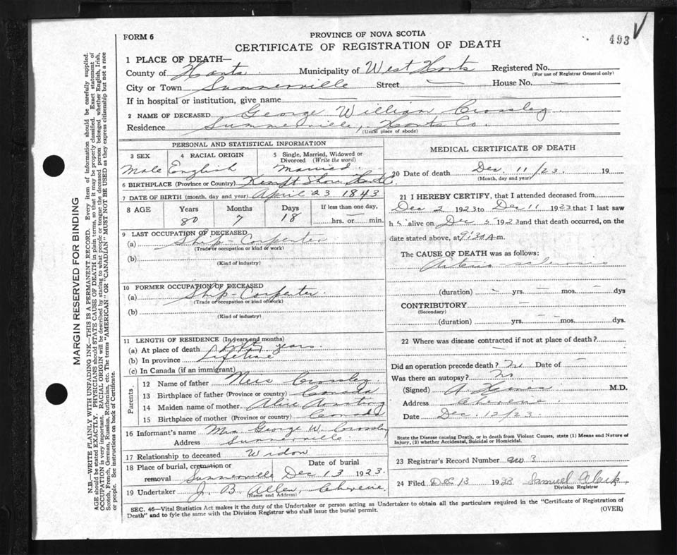 Male Death Registration: Year: 1923 file: 87 number: 493