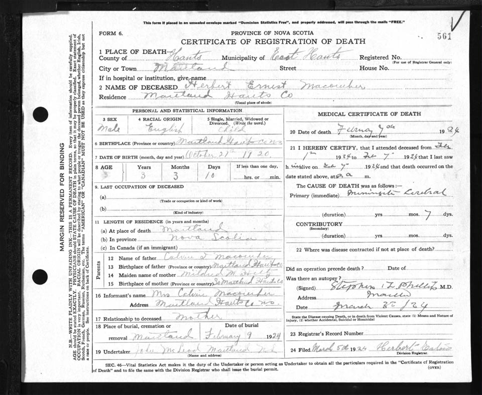 Male Death Registration: Year: 1924 file: 87 number: 561