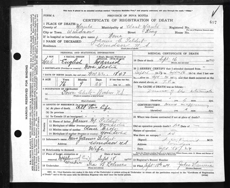 Male Death Registration: Year: 1924 file: 87 number: 687