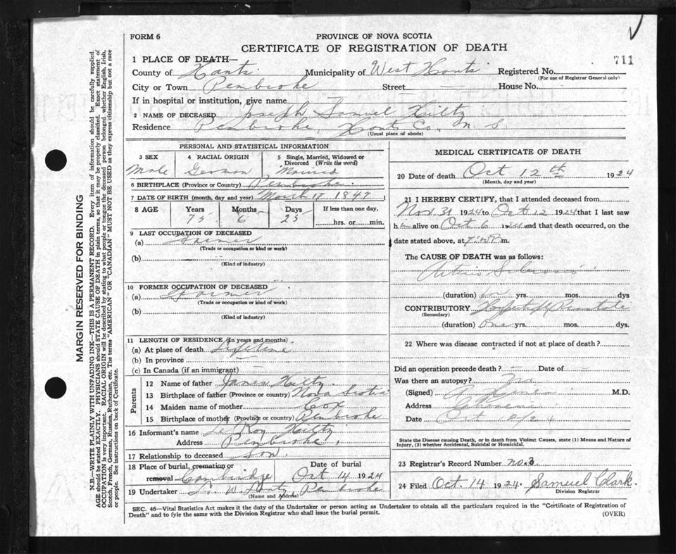 Male Death Registration: Year: 1924 file: 87 number: 711