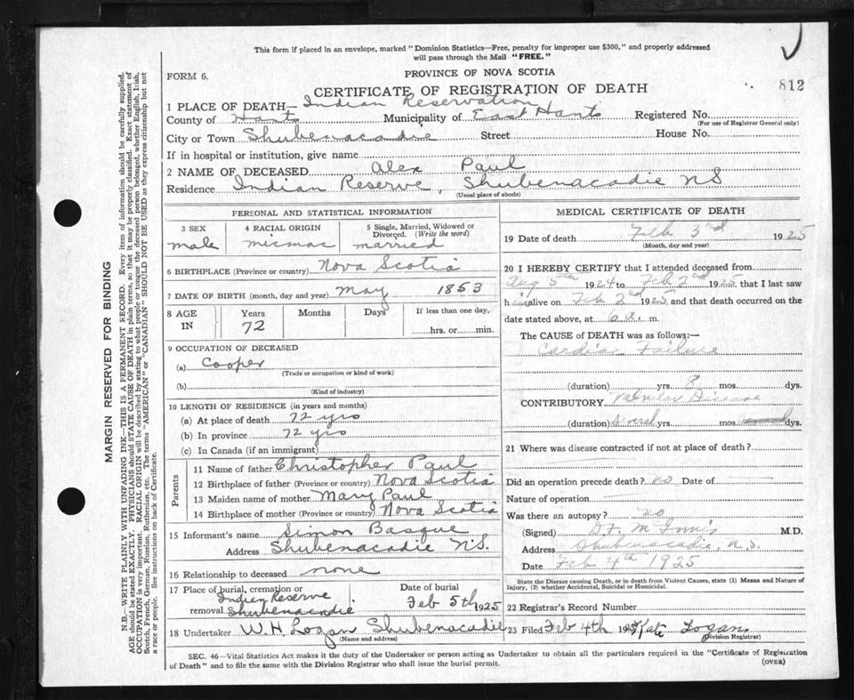 Male Death Registration: Year: 1925 file: 87 number: 812