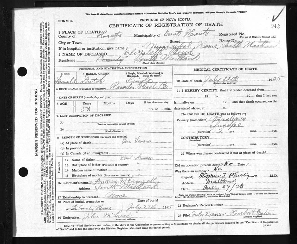 Female Death Registration: Year: 1925 file: 87 number: 943
