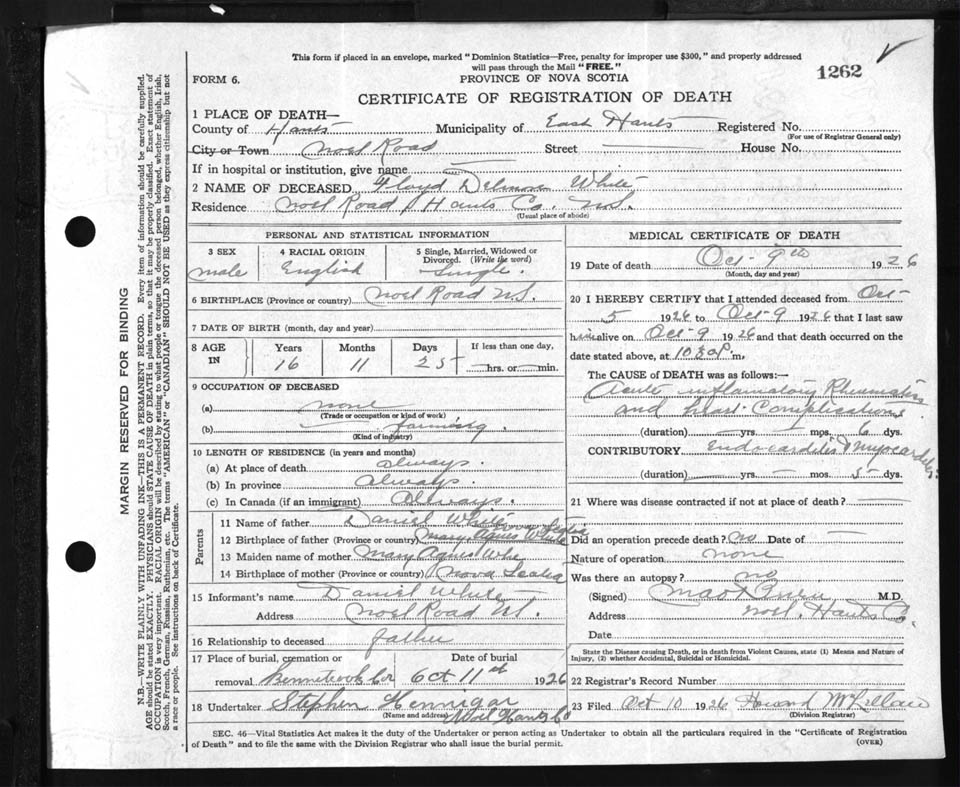 Male Death Registration: Year: 1926 file: 87 number: 1262