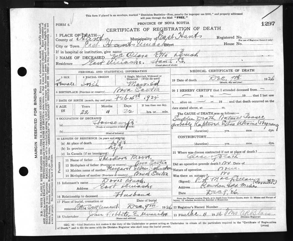 Female Death Registration: Year: 1926 file: 87 number: 1297
