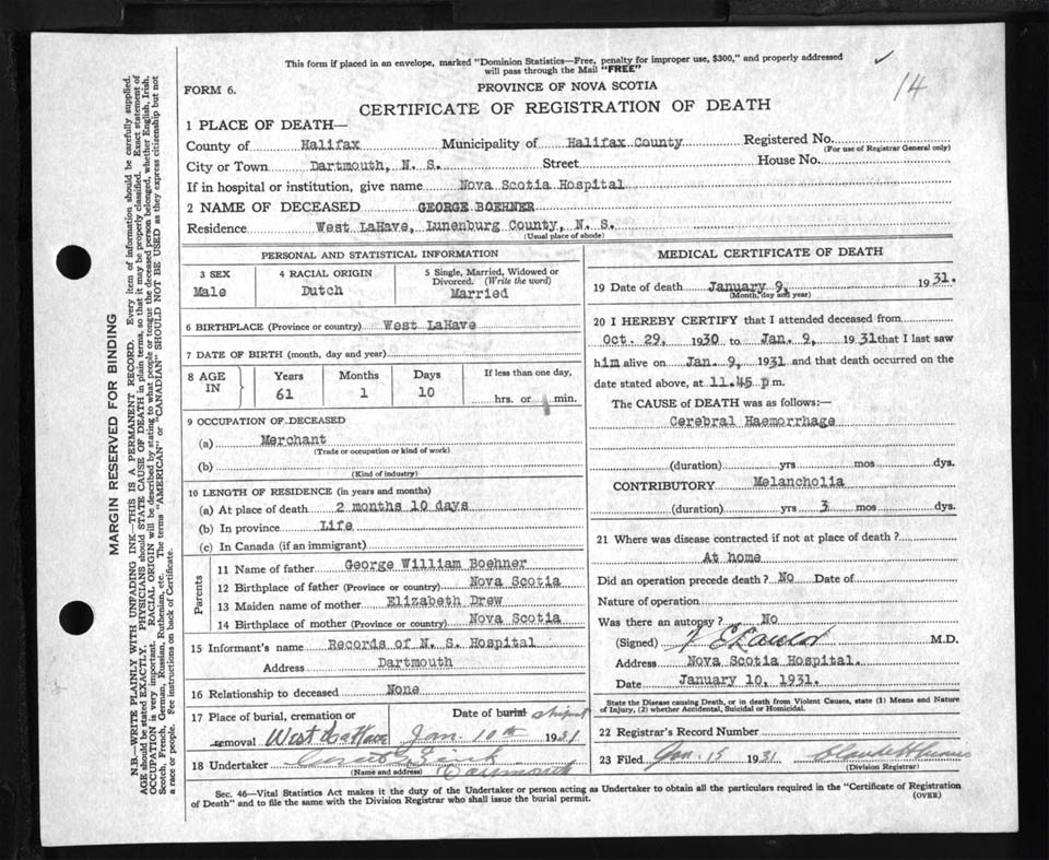 Male Death Registration: Year: 1931 file: 88 number: 14