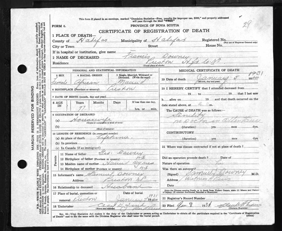 Female Death Registration: Year: 1931 file: 88 number: 29