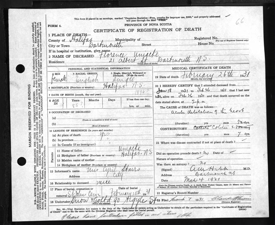 Female Death Registration: Year: 1931 file: 88 number: 66