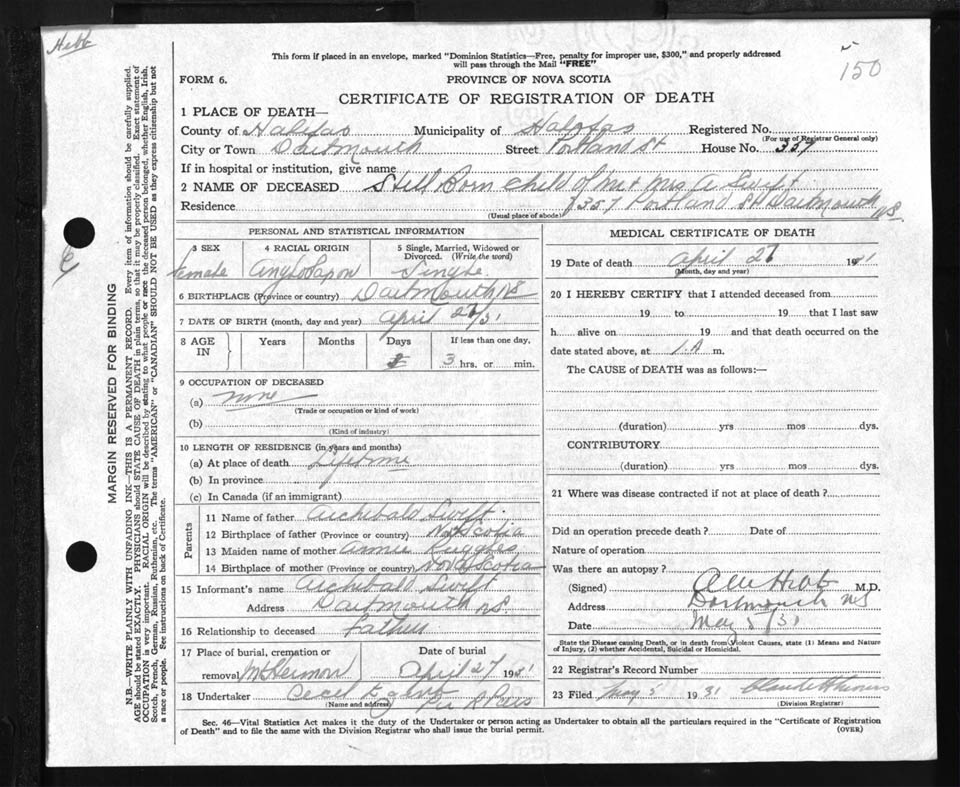 Female Death Registration: Year: 1931 file: 88 number: 150