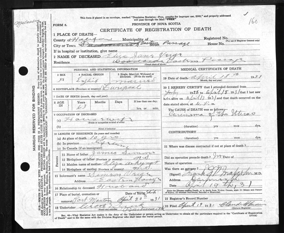 Female Death Registration: Year: 1931 file: 88 number: 160