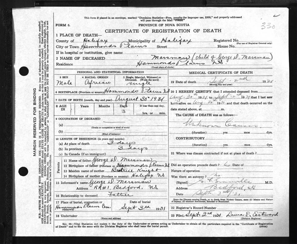 Male Death Registration: Year: 1931 file: 88 number: 330