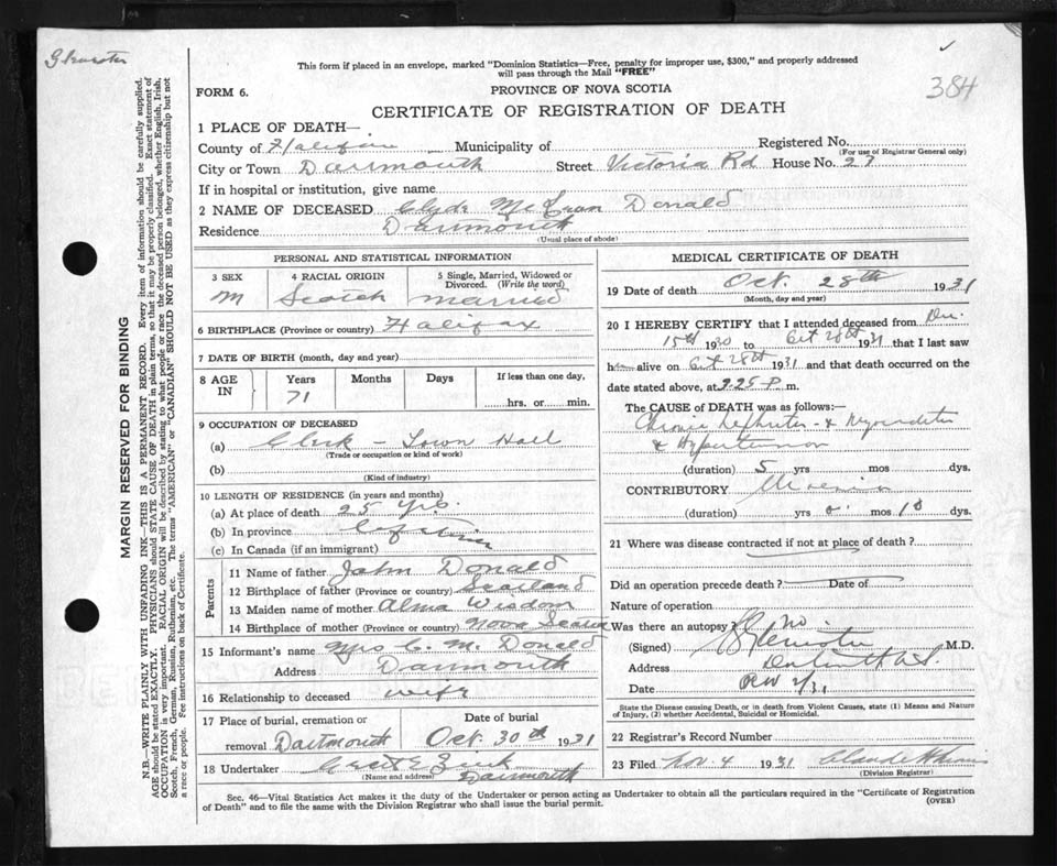 Male Death Registration: Year: 1931 file: 88 number: 384