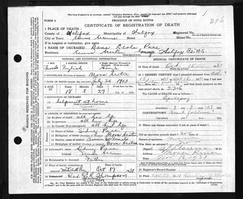 Female Death Registration: Year: 1931 file: 88 number: 396