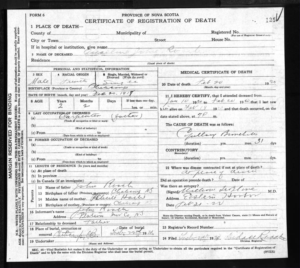 Male Death Registration: Year: 1920 file: 89 number: 125