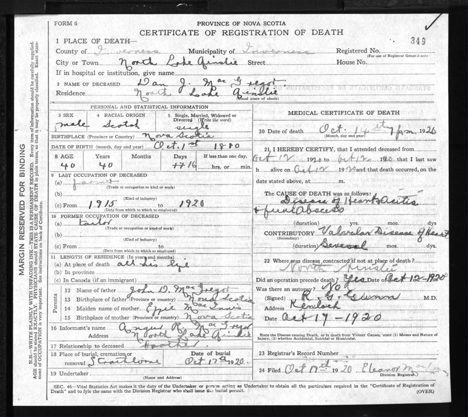 Male Death Registration: Year: 1920 file: 89 number: 349
