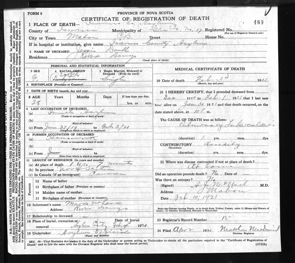Female Death Registration: Year: 1921 file: 89 number: 469