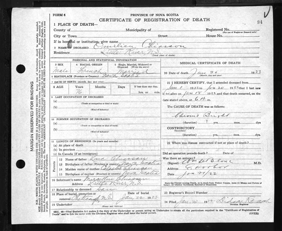 Male Death Registration: Year: 1922 file: 90 number: 94