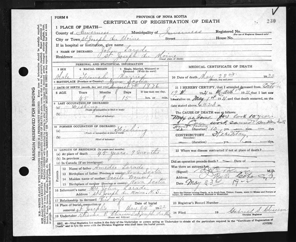 Male Death Registration: Year: 1922 file: 90 number: 230