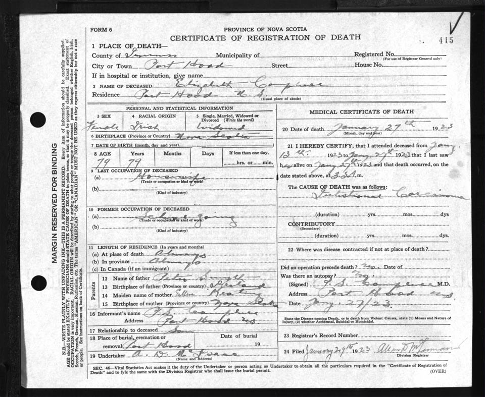 Female Death Registration: Year: 1923 file: 90 number: 415