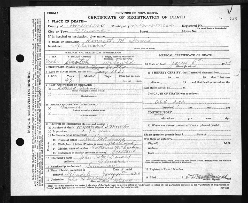 Male Death Registration: Year: 1923 file: 90 number: 438